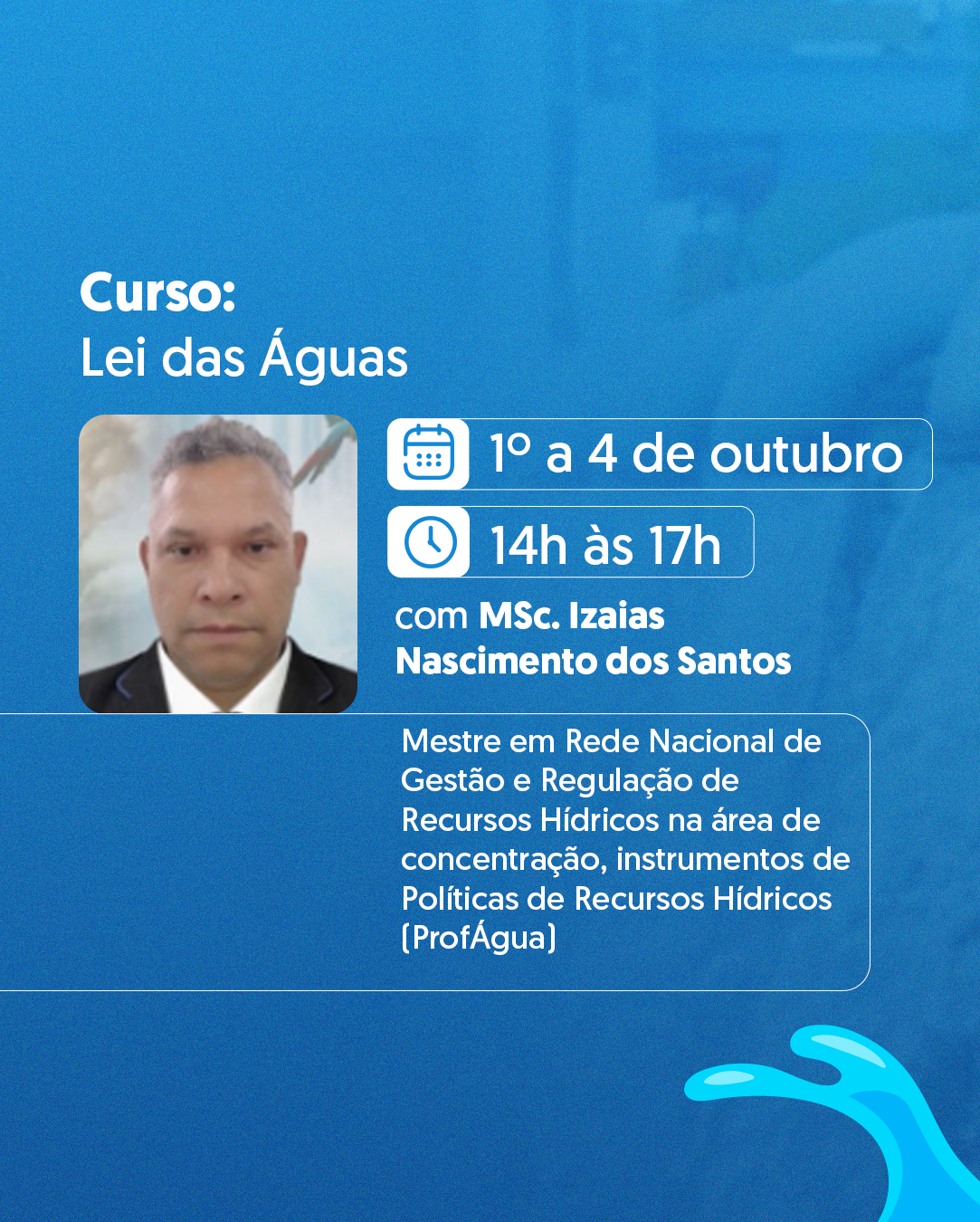 Os participantes aprenderão a implementar soluções inovadoras e eficazes, promovendo a sustentabilidade e a gestão integrada dos recursos hídricos. A inscrição para esta capacitação deve ser feita pelo formulário: https://forms.gle/U5gFV42ckem3fGZi6. Para inscrever-se neste curso, é necessário ter completado o curso “Lei das Águas”.
