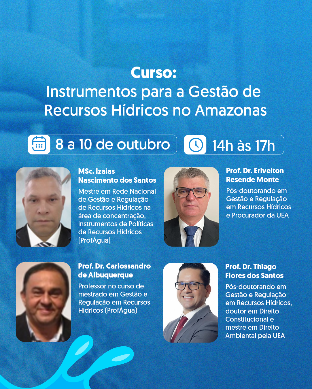 E o curso “Instrumentos para Gestão de Recursos Hídricos no Estado do Amazonas”, a ser ministrado entre os dias 8 e 10 de outubro, tem abordagem focada na região Amazônica, desde a análise de bacias hidrográficas até a aplicação de políticas públicas.