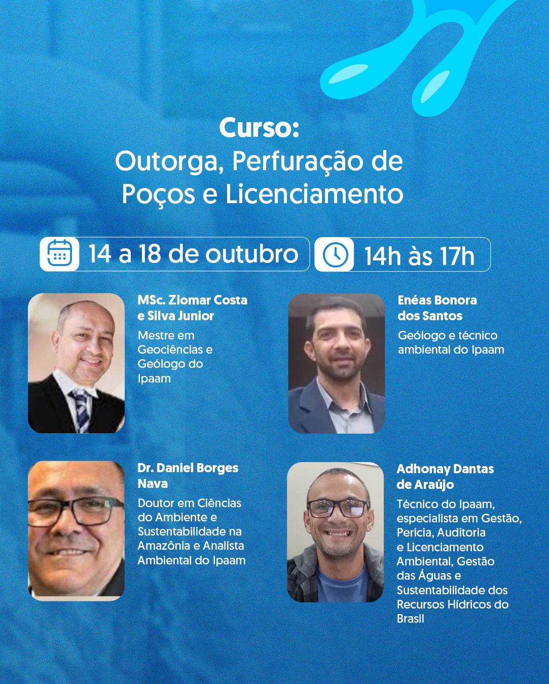 O terceiro curso será sobre “Outorga de Direito de Uso dos Recursos Hídricos, Perfuração de Poços e Licenciamento”, ministrado entre 14 e 18 de outubro. A proposta é uma compreensão aprofundada dos processos legais e técnicos necessários para a obtenção de outorgas para perfuração de poços e licenciamentos ambientais.