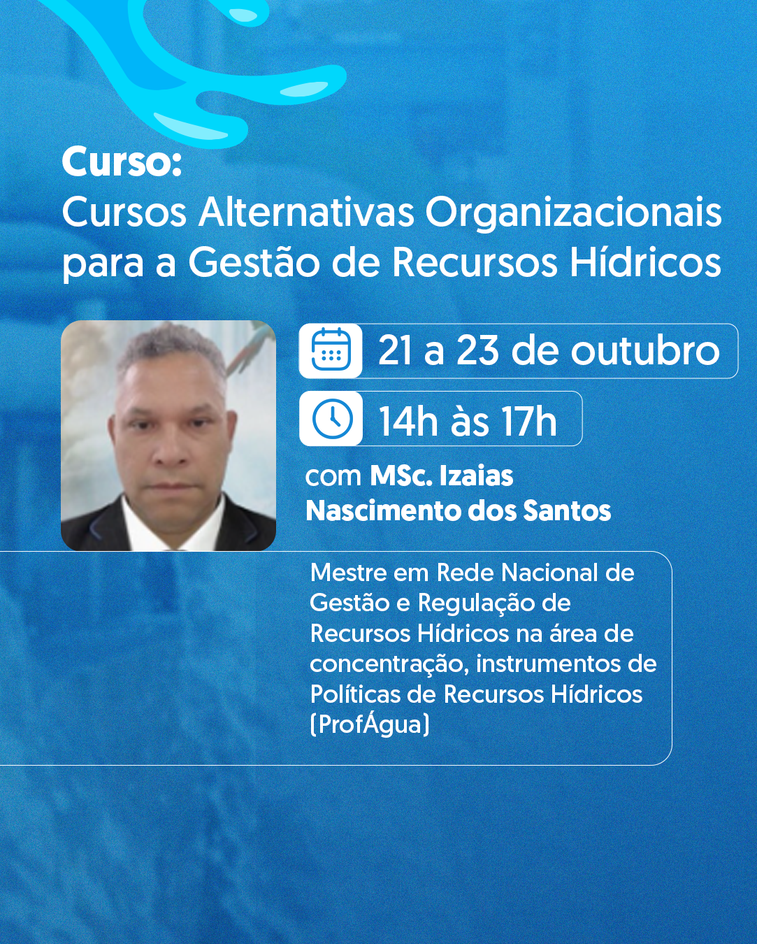 O último curso, “Alternativas Organizacionais para a Gestão dos Recursos Hídricos”, será oferecido entre 21 e 23 de outubro. Seu cronograma visa explorar diferentes modelos e estratégias organizacionais que podem ser aplicados para otimizar a gestão da água, adaptando-se às necessidades e contextos específicos.